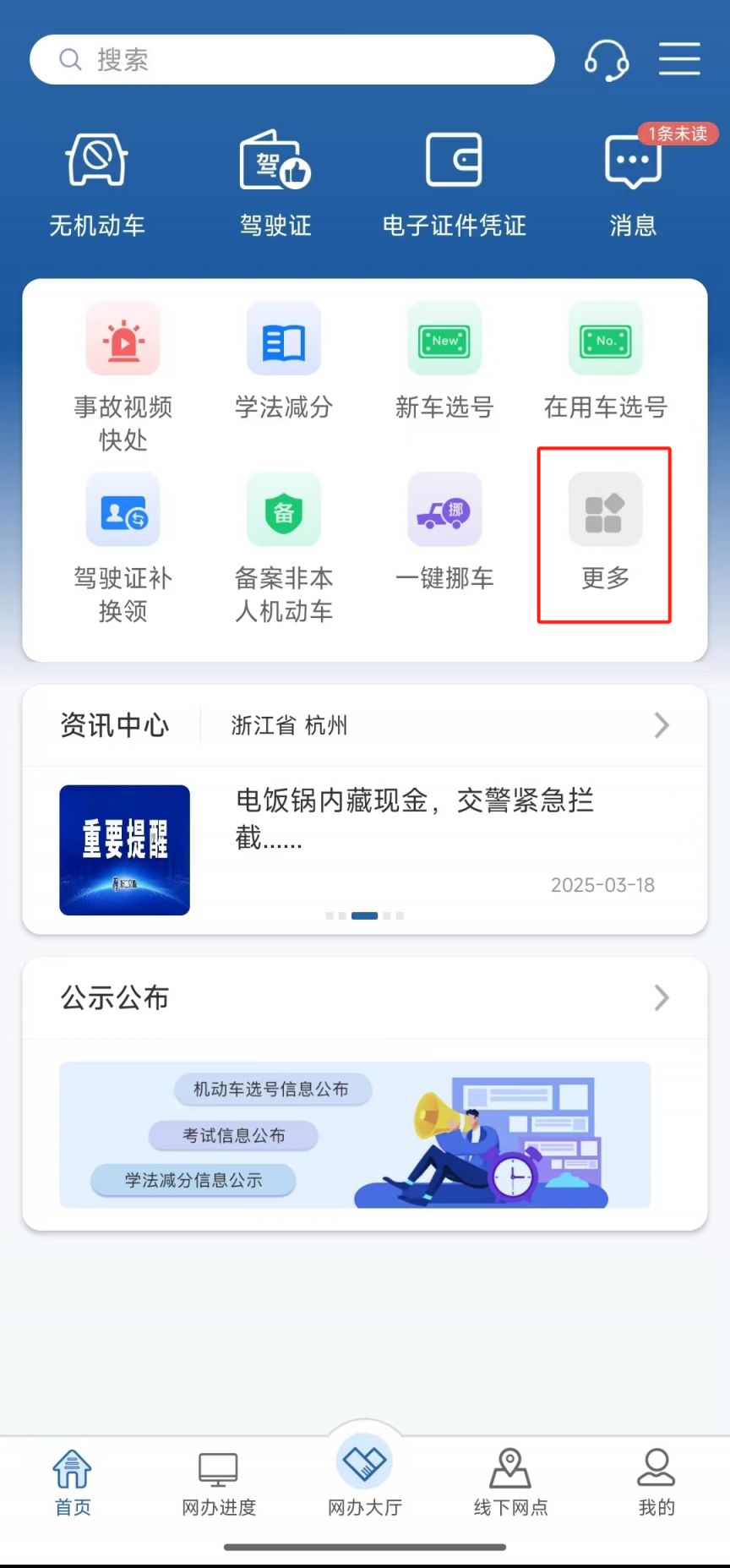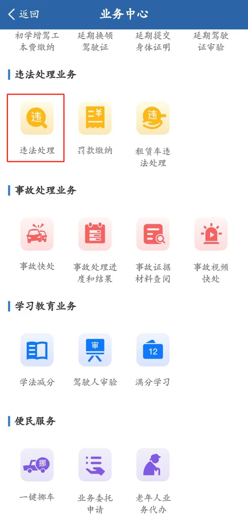 首先,登录成功之后,回到 APP 首页,而后,看到那个“更多”选项,点击进入。接着,在打开的页面裏,找到“违法处理业务”此项板块,其中,有个“违法处理”功能,平常处理违章之举都是从这里进入的。然而,今天我们所要查询的是缴款状态,所以,需要更换一个入口。
