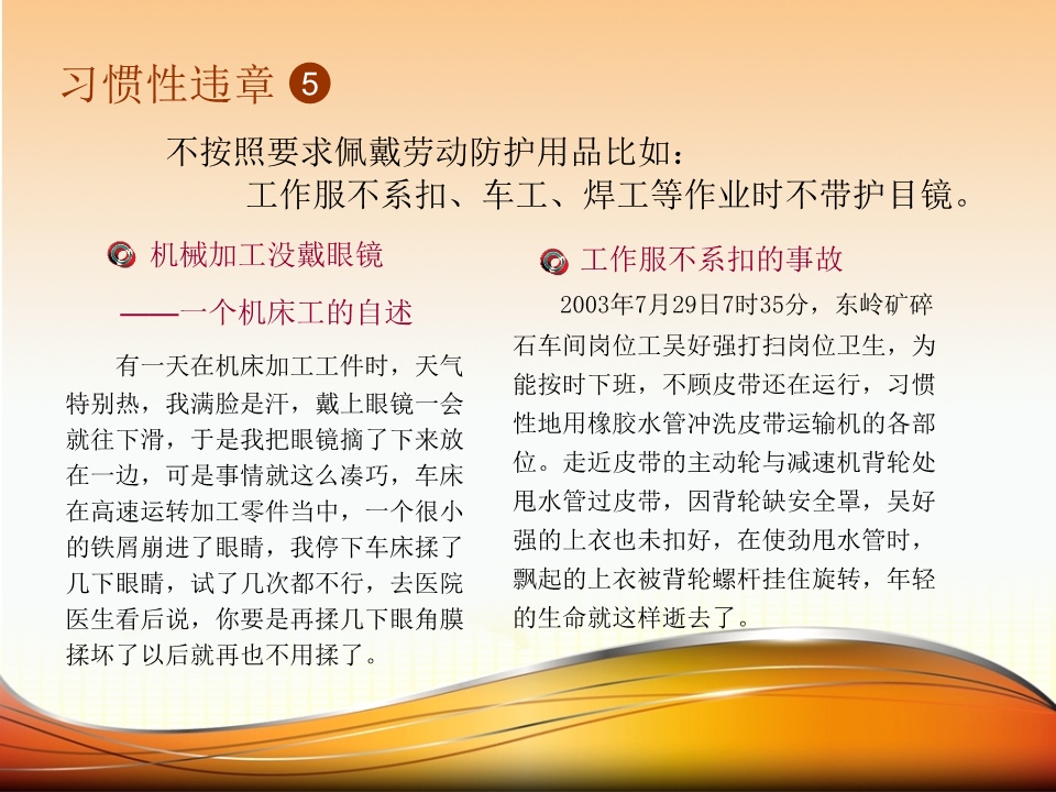 用戴着手套的手去抡那大锤,不料手套出现打滑致使大锤飞了出去,砸中了旁人的脑门。那砂轮机竟然没有防护罩,还在其正面进行操作,结果砂轮突然崩裂,碎片好似子弹一样打进了身体之中。在钻床进行加工时不使用卡具,工件快速飞转起来,居然能把人的胳膊绞成麻花状。