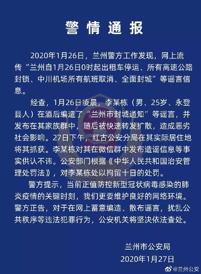2020年1月26日晚间时分,兰州的李某栋在酒后于自家之内编造了“兰州封城通知”,而后将其发送到家族群当中,结果在不到两个小时的时间里就已经传遍了整座城市。出租车停止运营,航班予以取消,高速施行封闭——这些相关的字眼致使多少市民在连夜之际出门去进行采购。最终他因为虚构事实从而扰乱了公共秩序而被拘留10日。在同一时期之内,造谣青岛、清远封城的传谣人员也全部都落入法网。