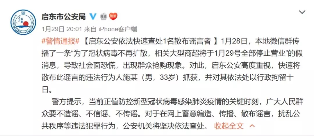 施某来自江苏启东,造谣“所有超市停业”致使群众抢购,被抓时辩称“只是转发”,然而警方调查表明,这条1月28 日流传的“紧急通知”乃是他首发,当地超市货架被扫空的画面于电视上播放,施某已被关进拘留所,造谣者决然想不到,自己编造的一句话会变成多少只推着购物车的掌握有多少辆推着购物车的手。
