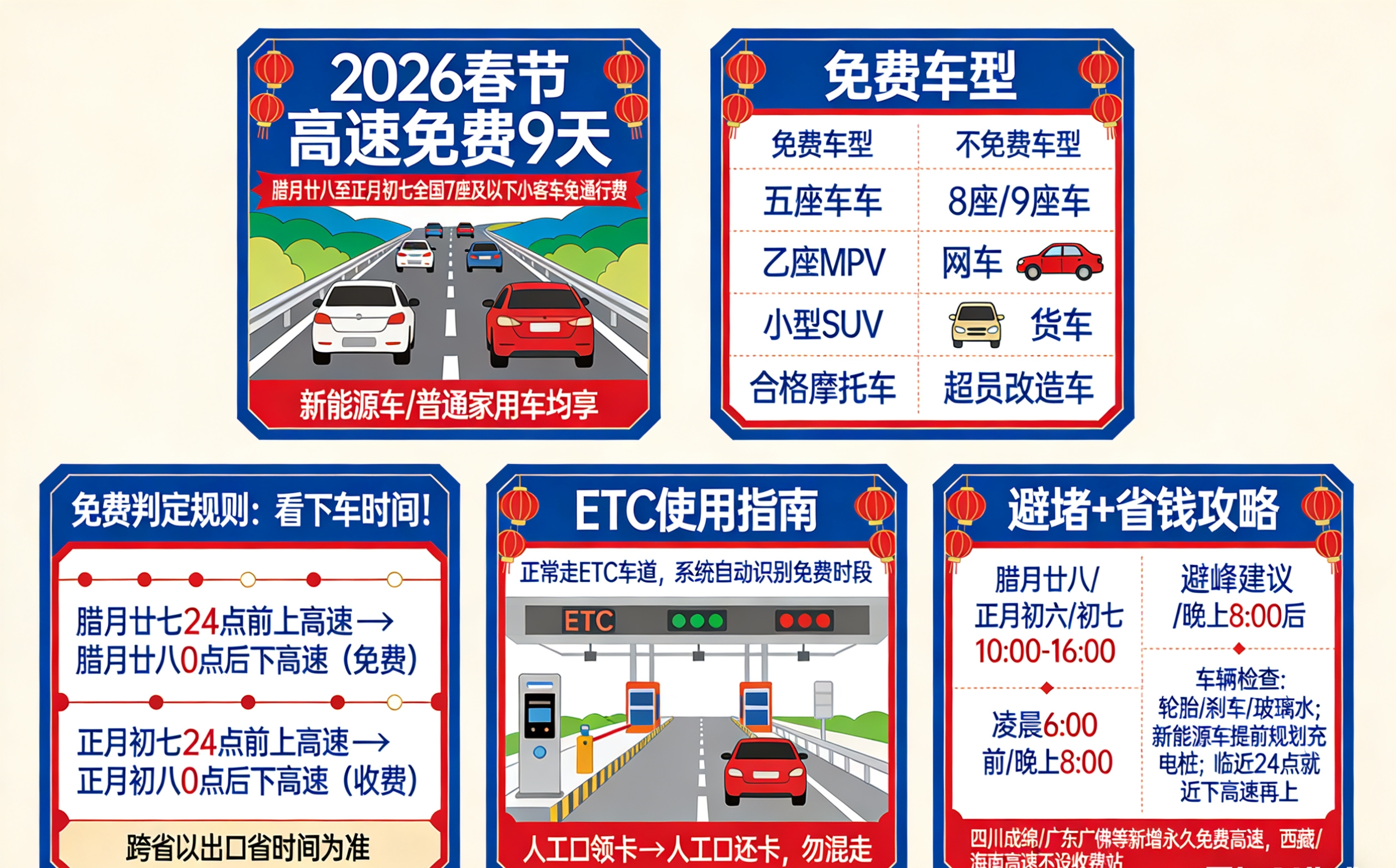 将在2026年春节期间实行高速免费这一消息确定下来了,免费时长达到了足足9天,时间范围是从腊月二十八一直到正月初七,如此一来这笔过路费就能够全省了,对于那些打算自驾回家或者准备出游的朋友而言,此次是真真切切可以省下一笔钱的。