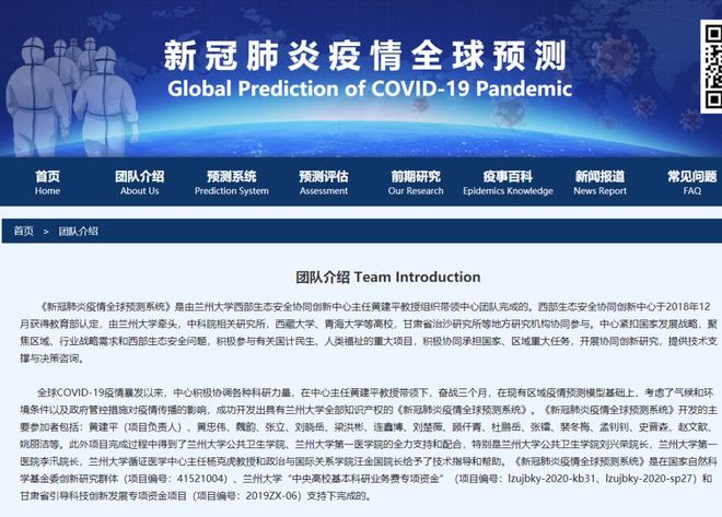 兰州大学西部生态安全协同创新中心有这么一套系统,早在2020年5月就已上线开始运行,它属于全球首个新冠肺炎疫情全球预测系统。该系统的创建者黄建平教授带领团队进行研究,将气象预测的模型方法加以改造后应用到了流行病学方面。在2021年初的时候,钟南山院士公开对此套系统关于北京新发地疫情的预测作出评价,称其“相当可靠”,而且和后来实际的发展情况基本相同。