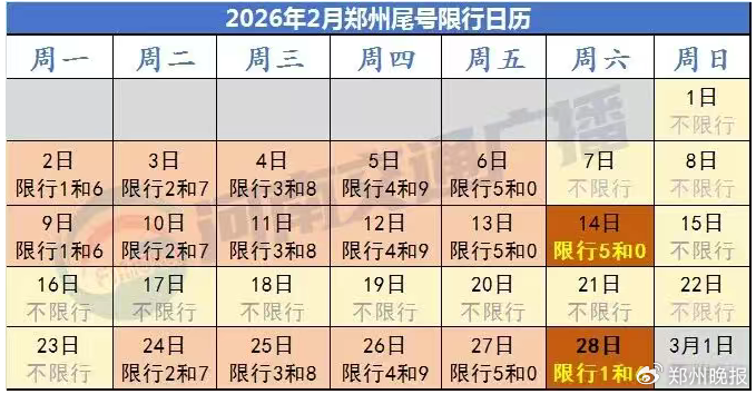 那郑州2月限行日历进行了人性化调整,在2月15日到23日这个春节假期及调休期间,全部都是不限号的。然而明天,也就是从7时到21时,尾号是2和7的车辆会照常限行,并且三环以内电子眼不会休息。要是跑错一天就要扣三分,这笔账比油价涨得还快呢。