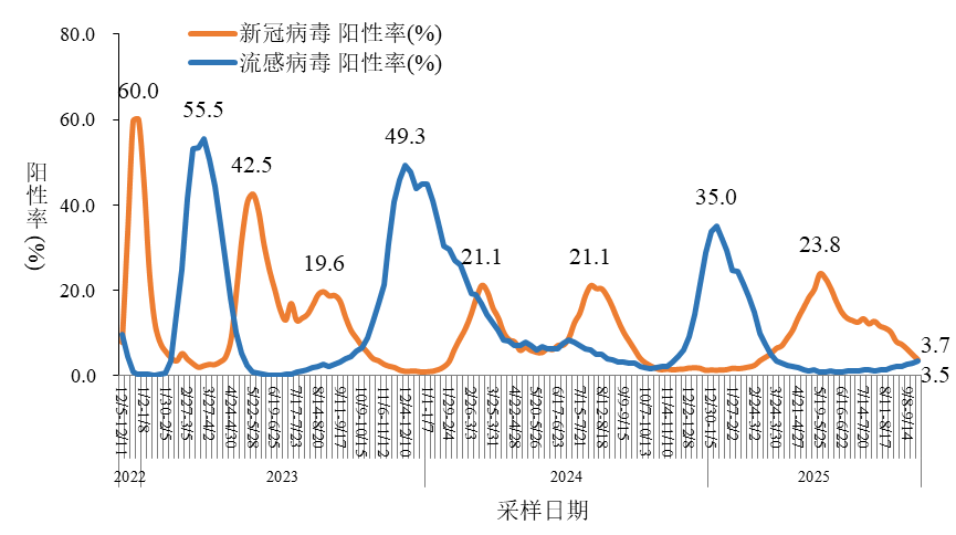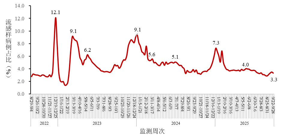 监测数据显示,全国范围内的哨点医院有着相关数据,其中流感样病例在门急诊就诊人数里所占的比例处在较低的水平。在第36周一直到第39周这个时间段内,该比例于3.1%至3.5%之间呈现出小幅的波动状态,并未出现异常的升高情况。