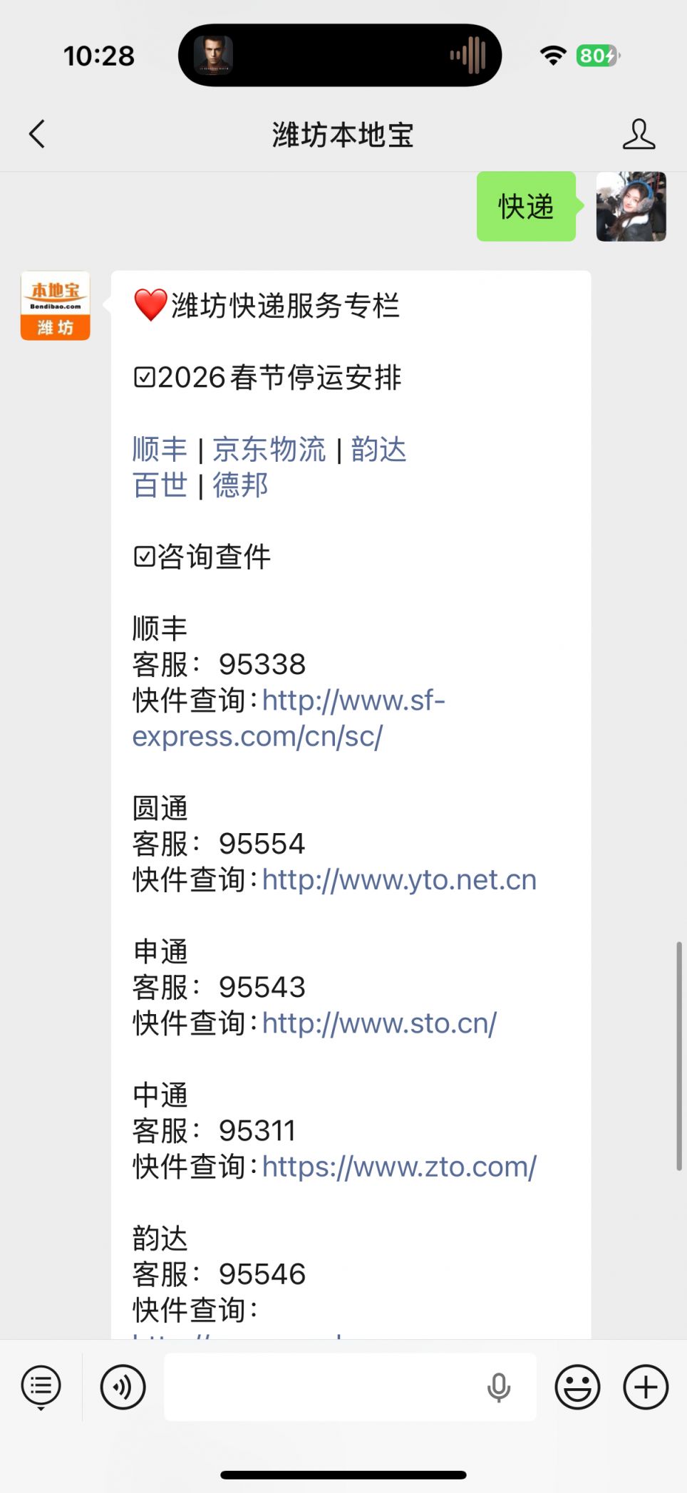 此外,要持续留意潍坊本地宝的更新情况,于对话框发送“快递”方可看到最新通知的。毕竟政策存在可能变化的情况,就像突然降下大雪那样,时效便又有所不同了。