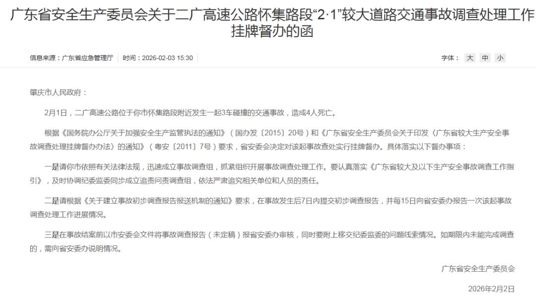 大年初六,也就是2月3日,大家都处于返程途中,然后呢广东省应急管理厅网站却公布了一则让人揪心的消息,是什么消息呢?原来是二广高速怀集路段于2月1日发生了一起3车碰撞的事故,接着4条鲜活生命就这样消失不见了。这起惨剧发生在春节返程高峰阶段,随后其直接触发了省级安全生产委员会的挂牌督办程序,最后给所有依旧在路上的司机敲响了警钟。