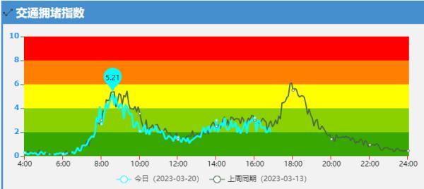 元宵节过后,真正的考验随之出现,分别是2月6日以及2月13日这两个周一的早晨高峰时段,拥堵指数的高点连续冲破6,各自达到了6.81与6.66,致使路面呈现出中度拥堵的状态,返工潮与开学季叠加在一起,使得众多开车送孩子的家长再次体会到堵在路上时的那种焦躁情绪,在今天(3月20日)早高峰8点35分的时候,拥堵指数为5.21,仍然在中度拥堵的界限上徘徊不定。