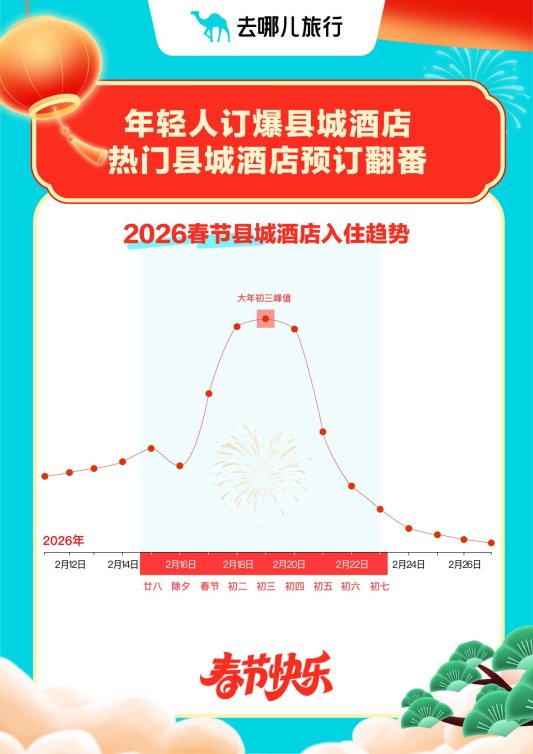 把新生活方式带回老家的是回县城过年的年轻人,去哪儿的数据显示,春节期间,旅客入住了包括全国千余个县城的酒店,多地酒店入住量呈现爆发式增长,非旅游景区类县城酒店的入住增幅超过60%,多个传统人口大县酒店的入住量实现翻倍。
