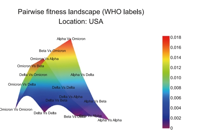 凭借所有两两相较的成果,研究团队头一回搭建起新冠病毒主要变异株的“进化适应性景观”三维图谱,这一地形图使得抽象的进化优势清晰可见。