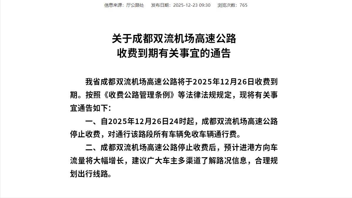 12月27那一天,位于成都的双流机场高速正式彻底停止收费,进而成为四川第三条推出的免费高速路段。这可是一条连接市区与机场的关键重要通道,在其收费期圆满结束之后对每一辆通行车辆均把大门敞开。实际上早在它正式停止收费之前,四川的成绵高速已然实现免费通行状态,这些公路当中大部分是在上世纪90年代末期建成并通车的,算起来历经20多年收费之后,依据2004年颁布的《收费公路管理条例》所规定的内容来说,政府还贷性质的公路收费上限设定为15年时长,经营性公路最长收费年限为25年,到如今恰好都到了类似“退休年龄”一般的阶段。