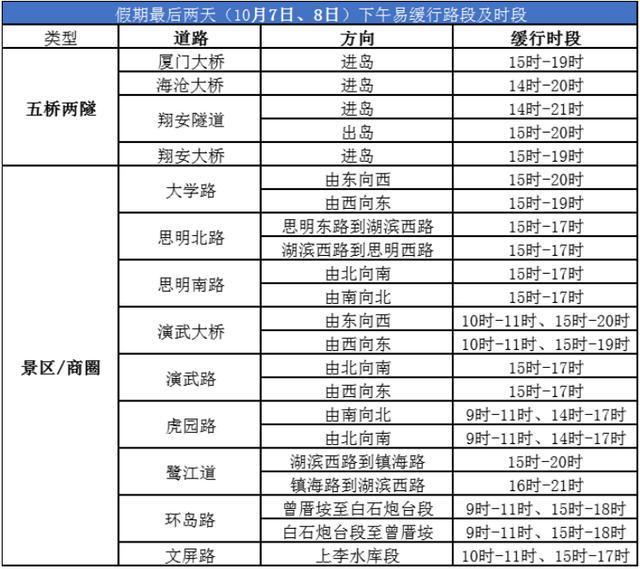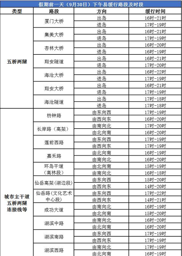 9月30日下午4点刚过,便出现了这样的情况,海沧大桥出岛方向开始排队,翔安隧道出岛车流也开始排队,晚高峰与通勤流叠加在一起,拥堵将会持续到晚上9点半。10月1日上午8点至11点是又一个出岛高峰,厦门收费站车流反灌海翔大道,杏林收费站拥堵影响杏前路的状况会再次呈现。返程集中在10月7日、8日下午3点到9点,高速公路出口和进岛方向压力最为巨大,建议错开下午2点至5点这个最为拥堵的时段。
