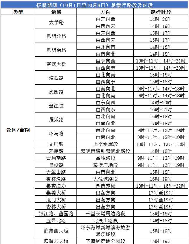 10月1日起至8日,全市范围内,除了环岛路靠山那一侧的433个车位按照正常标准进行收费之外,有2.3万个路内停车泊位在全天的时间里都是免费开放状态。因应旅游大巴存在停车困难这一情况,厦港、第一码头、溪头下、胡里山、会展中心、邮轮母港这6个公交场站,腾挪出51个大型车停车位以及37个小型车车位,免费提供给游客去使用。交警给出建议,大巴应当优先选择停在城市外围区域,然后再通过换乘公交进入城市核心区域,以此来避免在狭窄道路上进行掉头操作从而引发交通拥堵。