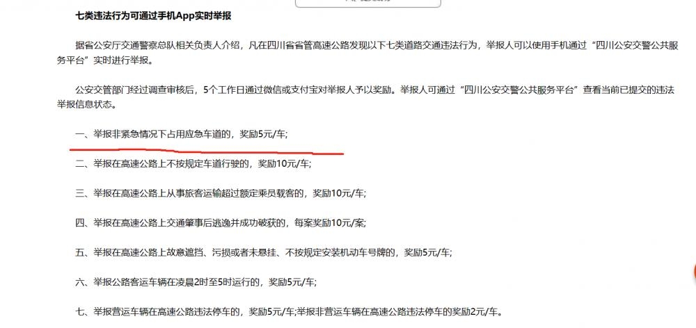 有着差异极大的各地高速公路违法举报奖励标准,四川省人民政府官网所公布的奖励措施表明,举报占用应急车道每一起仅仅奖励5元,其他违法行为像不按规定车道行驶奖励10元,超员载客奖励10元,肇事逃逸破案之后每一个案件奖励10元,故意遮挡号牌、客车凌晨2时至5时运行、营运车辆违停等举报每一起给予奖励5元,非营运车辆违停却只有2元,四川也同样设置了每月累计奖励不超过100元的上限。