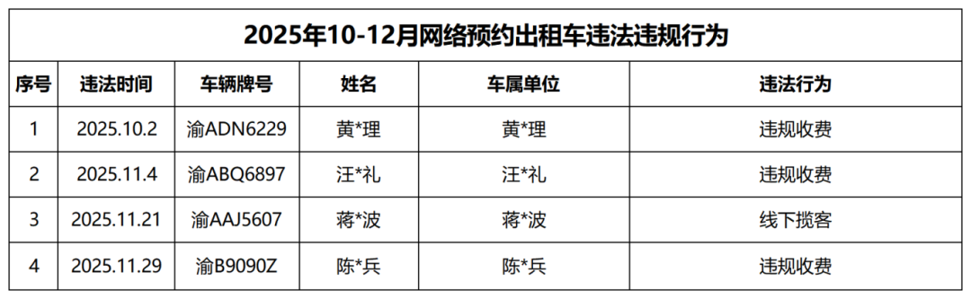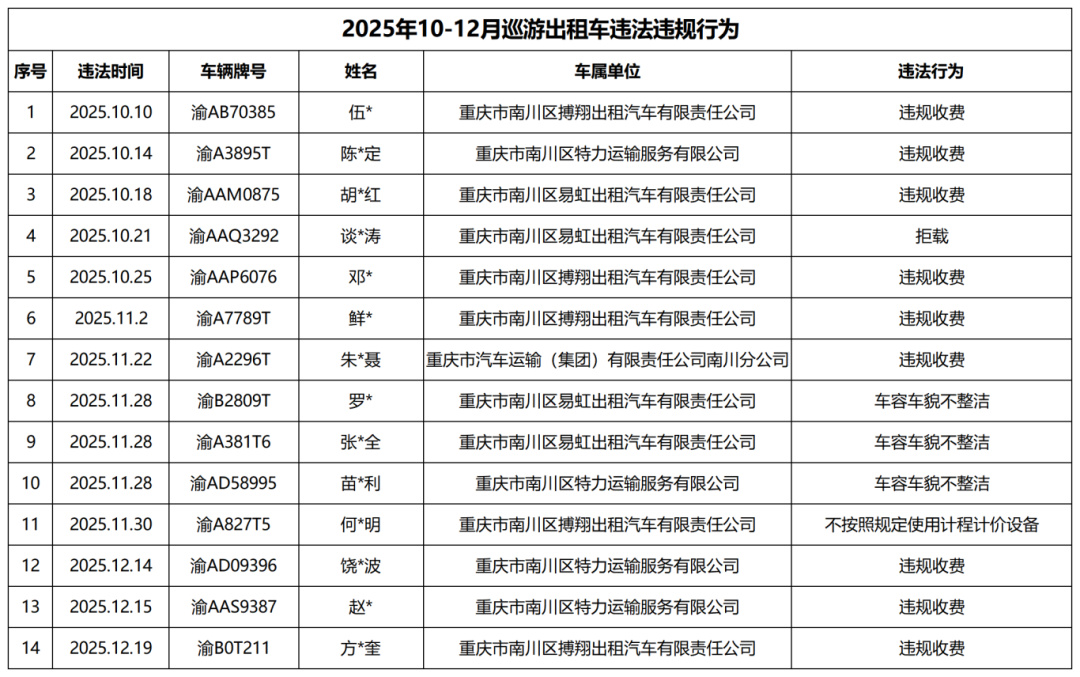 留意呀,出租车司机们!在2025年的第四个季度,存在着别的一批同行,他们由于拒载、议价、绕道的行为,而被查处,继而被公开曝光,于这个阖家团圆的春运时节里,千万不要因那蝇头小利而去砸断自己的饭碗,更不要给乘客的回家路途增添阻碍呀!